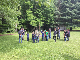 This weekend was the annual spring camp-out. Around 100 people (Scouts and their families) came to the camp, which included a ceremony celebrating the Scouts achieving their Ranks. Some families camped on Friday night, with most arriving Saturday afternoon for dinner, the flag raising ceremony, and then the Pack meeting. The Pack meeting was a really fun event, circled around the campfire, where the Scouts did skits and were then rewarded for completing their requirements and achieving their Rank.